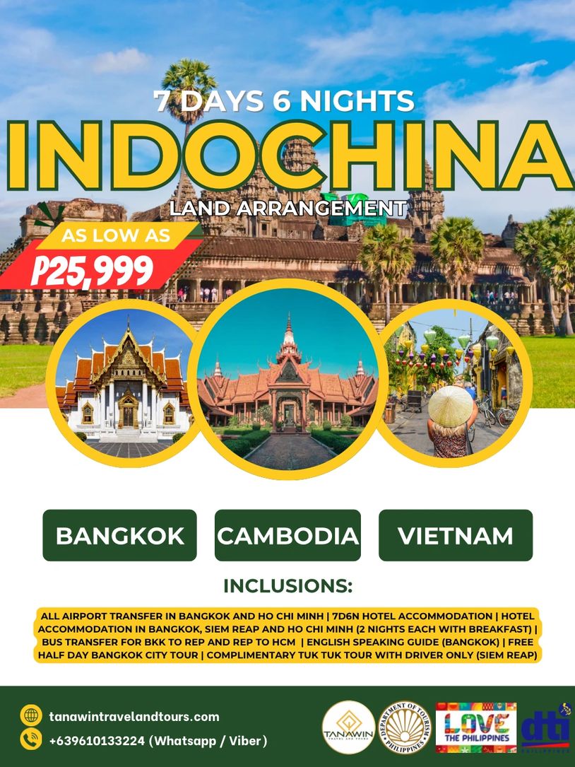 ✔ Hotel Accommodation in Bangkok, Siem Reap and Ho Chi Minh (2 nights each with breakfast)